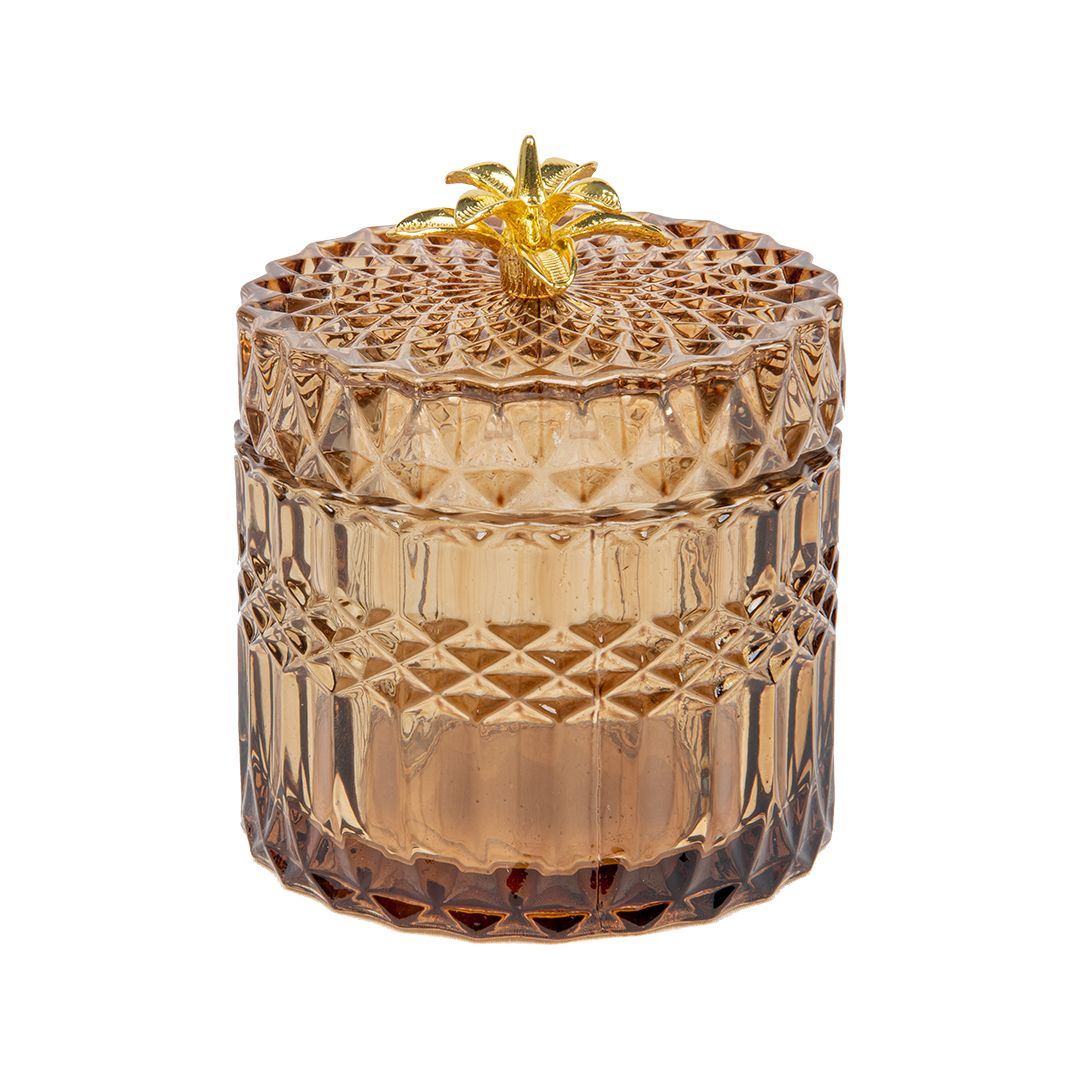 Удобная ручка в виде нескольких золотистых лепестков, трендовые оттенки – зеленый, оливковый, шоколадный; округлая форма и прозрачный орнамент – всё соответствует популярным природным мотивам в интерьере. Шкатулка с переливающимися на солнце или в свете ночника гранями выглядит как настоящая драгоценность и элегантно украсит собой ваш подзеркальный столик
