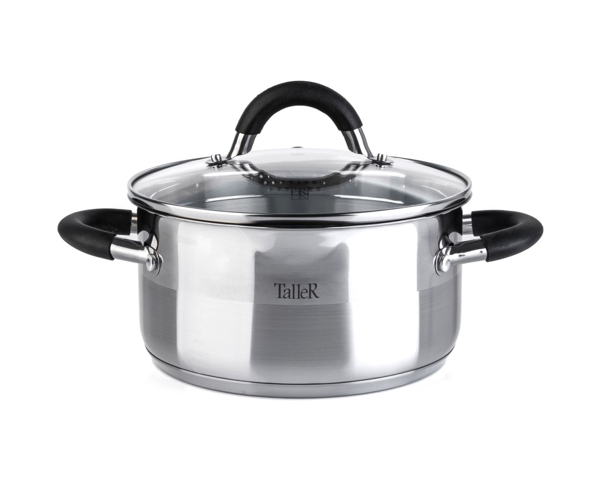 Кастрюля выполнена из нержавеющей стали - 18/10. Капсулированное дно. Полировка внешняя - комбинированная, что создает уникальный внешний вид кастрюли, внутренняя - матовая. Крышка из жаропрочного стекла с отверстием для выхода пара и широким металлическим ободком с отверстиями для слива жидкости. Форма края кастрюли предусматривает желобок для удобного слива жидкости. Ручки из нержавеющей стали с силиконовыми вставками. Есть отметки литража.