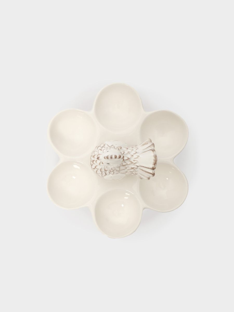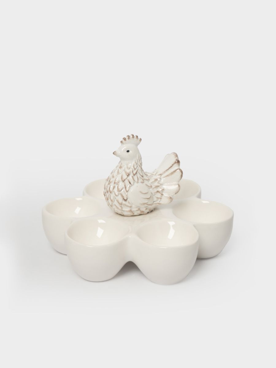 Элегантное блюдо для яиц с декоративной фигуркой курицы — изысканный элемент сервировки, который придаёт столу особое очарование и атмосферу уюта. Продуманный дизайн с шестью аккуратными отделениями позволяет красиво разместить яйца, сохраняя их устойчивость и аккуратный вид.