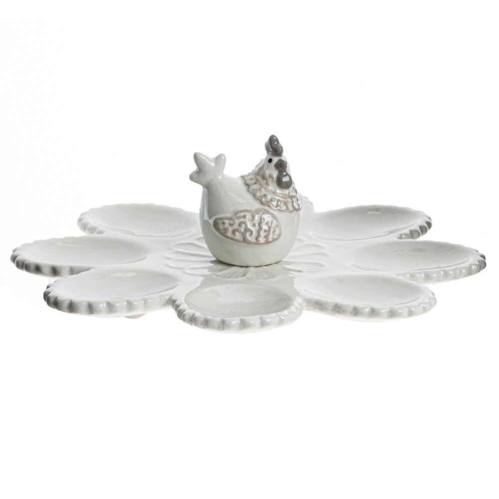 Элегантное блюдо для яиц с декоративной фигуркой курицы — изысканный элемент сервировки, который придаёт столу особое очарование и атмосферу уюта. Продуманный дизайн с восемью аккуратными отделениями позволяет красиво разместить яйца, сохраняя их устойчивость и аккуратный вид.