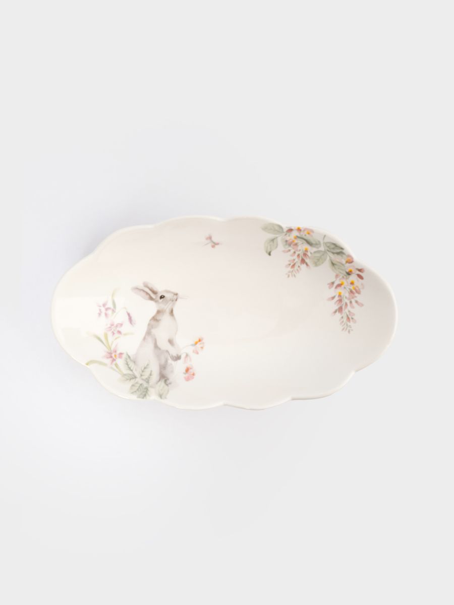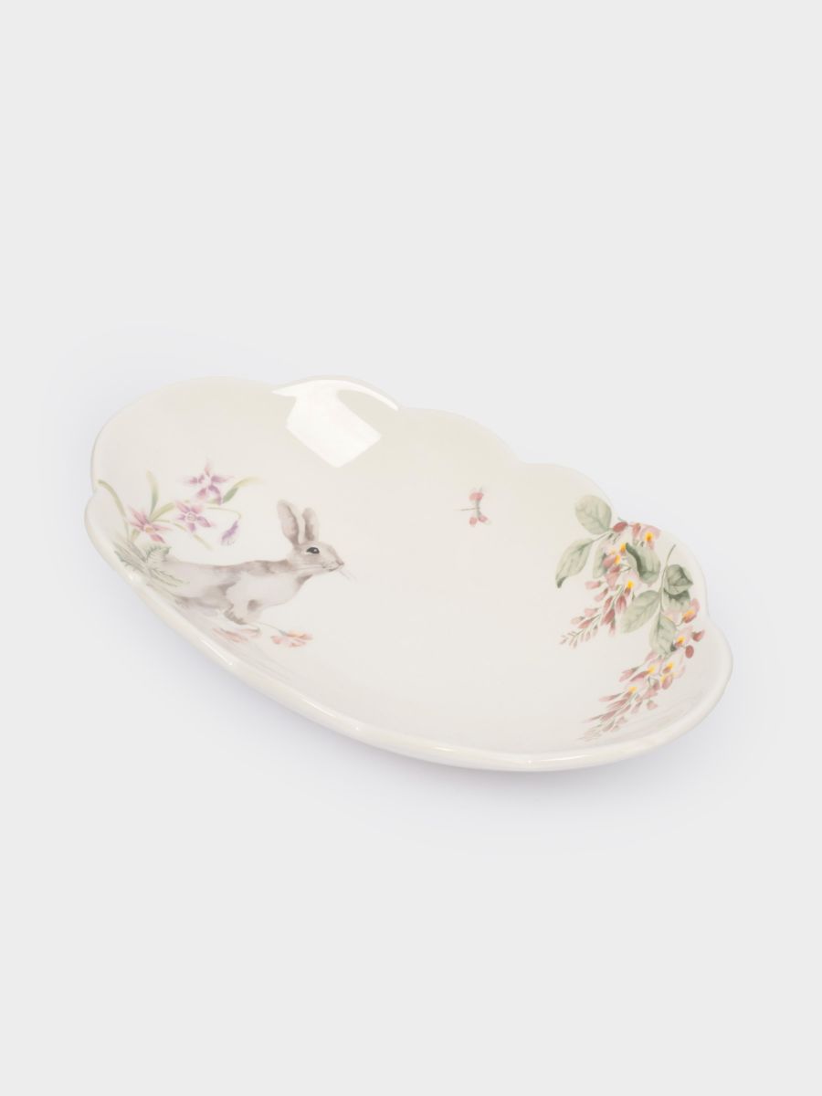 Оформленное в стиле, вдохновленном природными мотивами, овальное блюдо выполнено с изображением милого зайца — символа грации и легкости.