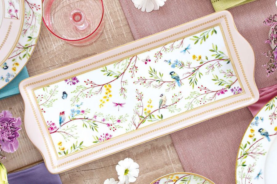 В линейку Пение птиц входят элегантные, утонченные блюда, тарелки, салатники, чашки с блюдцами, кружки, а также другая столовая посуда и предметы сервировки, изготовленные из прочного белого фарфора с износостойким глазурованным покрытием. Изделия имеют изящные формы, напоминающие силуэты предметов из коллекции Цветочный карнавал – одной из наиболее успешных и популярных серий бренда. Восхитительный цветочный декор с миниатюрными птичками выглядит нетривиально и оставляет приятное «послевкусие».