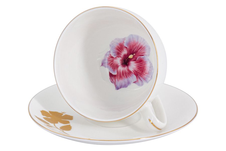 Удобные и современные формы предметов из белоснежного костяного фарфора и натуральный яркий цветочный декор с изображением мака, миддлемиста, гибискуса, ириса, магнолии, стрелиции, камелии и гортензии в сочетании с цветами из матового золота, тонкая золотая отводка — всё говорит о стиле в сервировке и культуре чаепития.