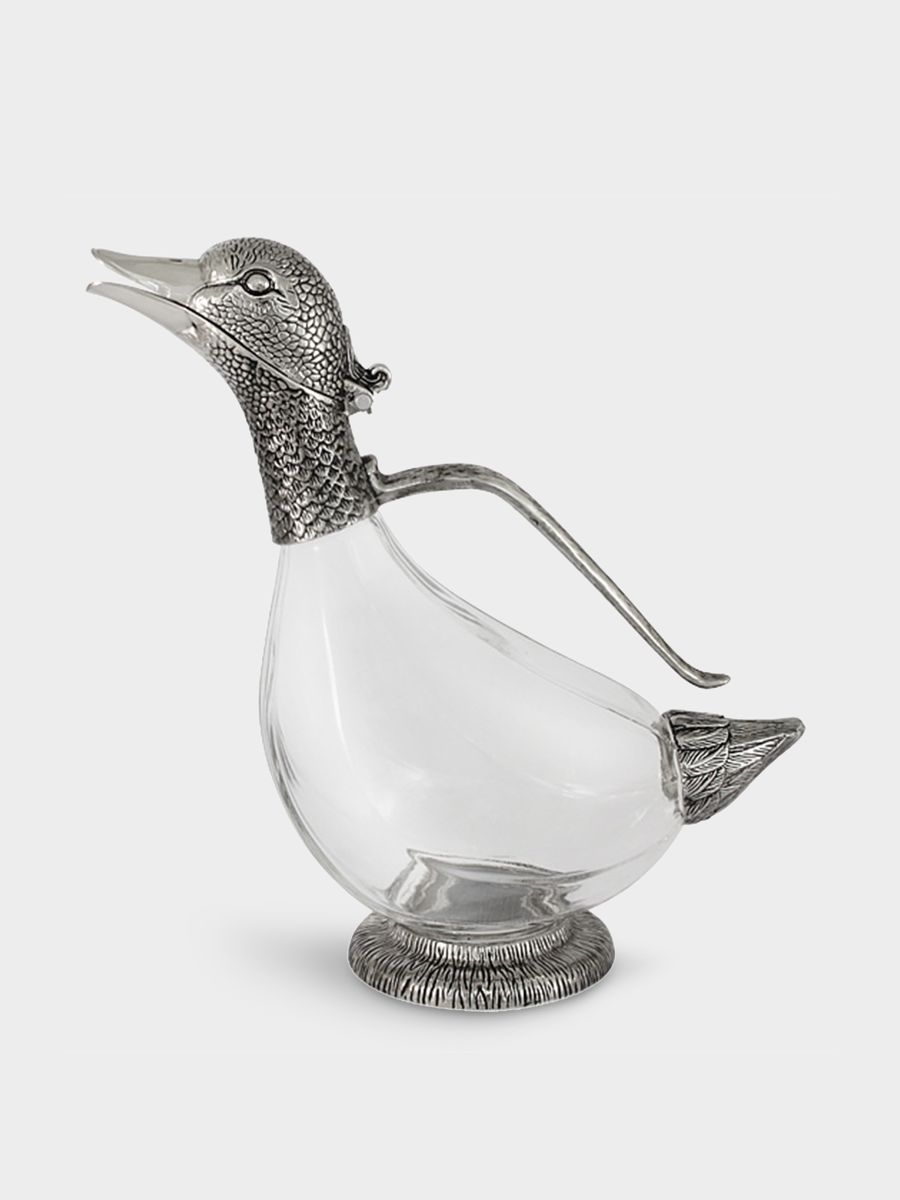 Декантор в виде утки — это оригинальный и стильный аксессуар, который станет ярким акцентом в интерьере и подчеркнёт изысканный вкус хозяев дома. Необычная форма в виде грациозной утки привлекает внимание и превращает подачу напитков в настоящее эстетическое удовольствие.