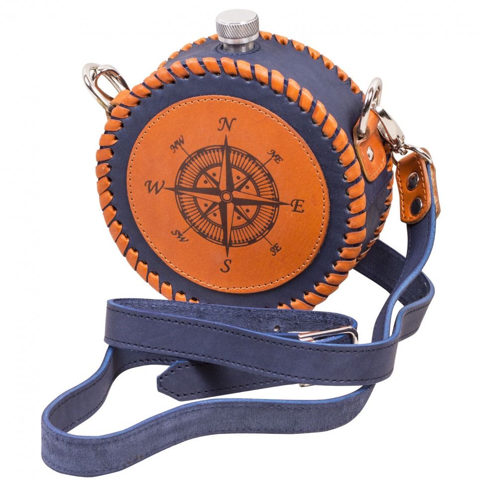 Фляга походная 500 мл, натуральная кожа, синий компас