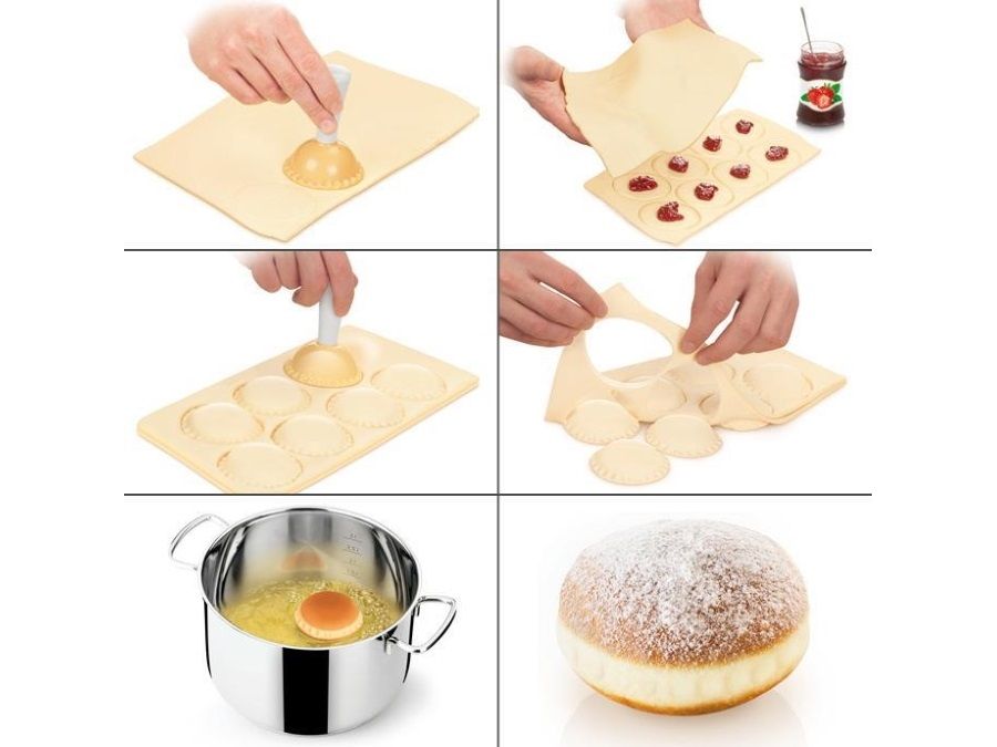 Удобная форма для пончиков с начинкой. Диаметр – 7 см. Сделана из пластика, можно мыть в посудомоечной машине