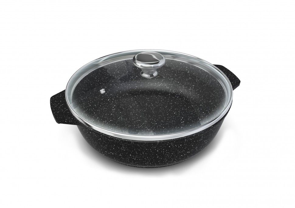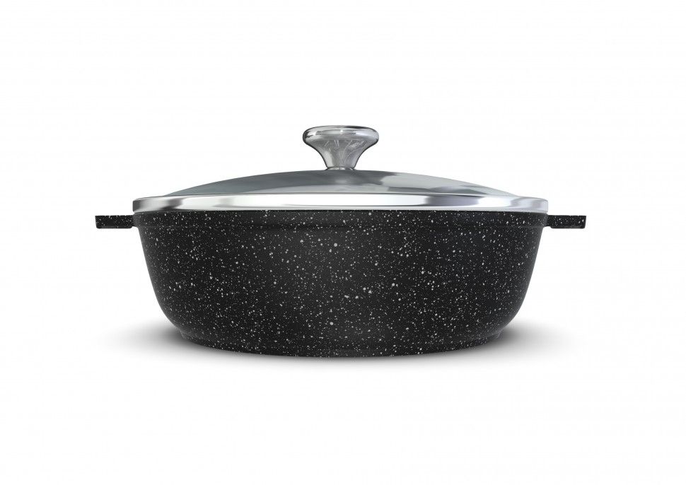 Жаровня – это разновидность глубокой сковороды, имеющая две цельнолитые ручки. Корпус жаровни изготовлен из алюминия методом литья с кристаллизацией под давлением, такой корпус не подвержен деформации и обеспечивает равномерный нагрев.