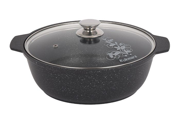 Кастрюля-жаровня "Kukmara" изготовлена из литого алюминия и покрыта инновационным антипригарным мраморным покрытием нового поколения на водной основе, усиленным сверхтвердыми частицами минералов.