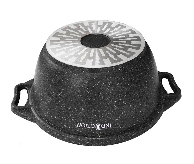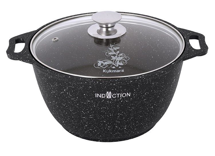 Кастрюля "Kukmara" для индукционной плиты изготовлена из литого алюминия и покрыта инновационным антипригарным мраморным покрытием нового поколения на водной основе, усиленным сверхтвердыми частицами минералов.