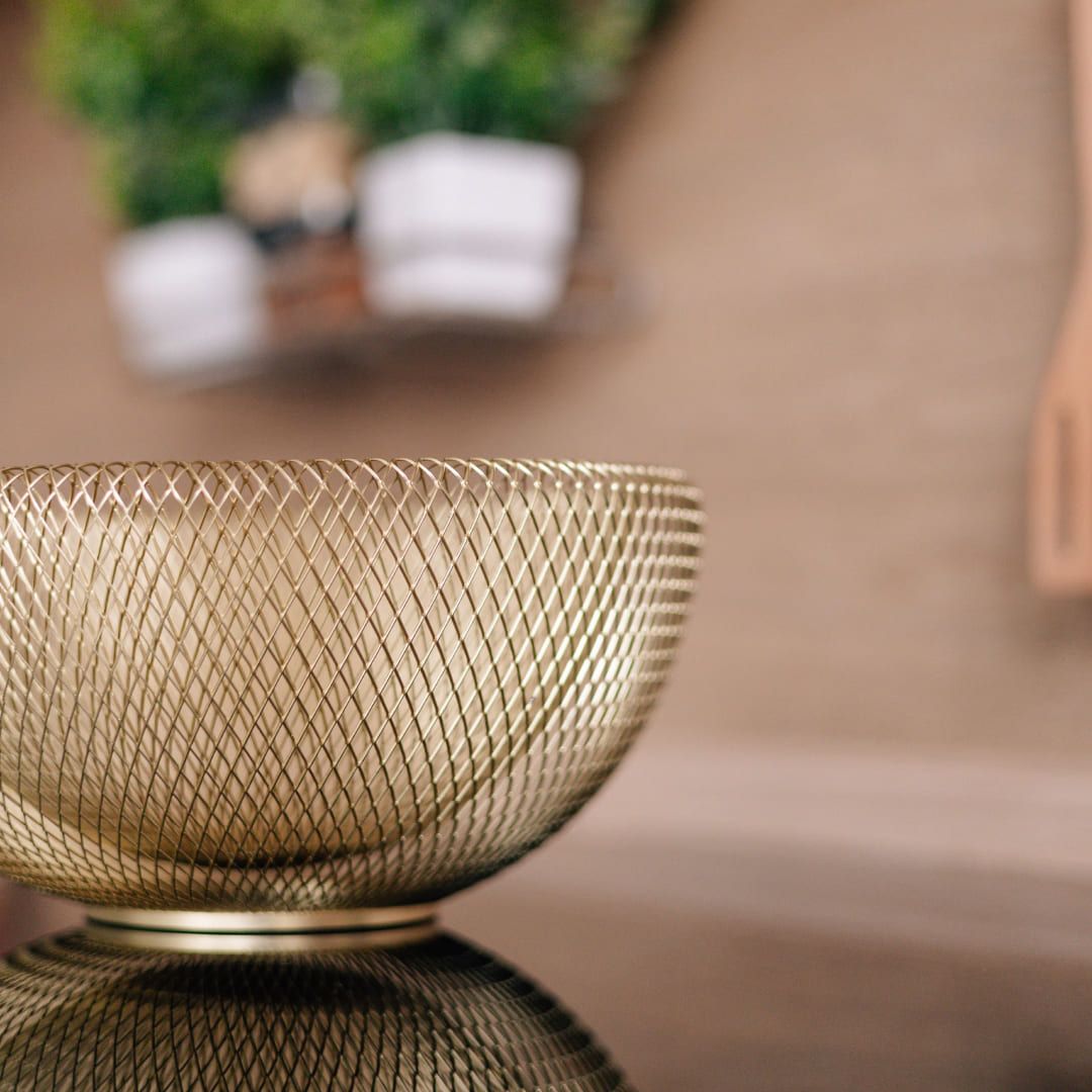 Фруктовница впишется в большинство современных интерьеров. Строгая геометрия и трендовый цвет матовое золото делают ее заметной на фоне стола, при этом создают контраст между ней и яркими фруктами. Такой оптический эффект окажется особенно полезен владельцам кафе и ресторанов — получится увеличить средний чек со стола.