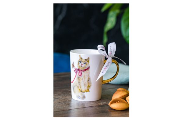 Кружка «Кошка-милашка» станет отличным подарком на праздники. Она украшена красивой атласной лентой. Золотистая ручка выгодно оттеняет благородную белизну фарфора, подсвечивая его и придавая особый шарм. Благодаря объему 450 мл и конической форме, изделие идеально подходит для сервировки чая или кофе.