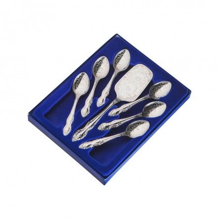 В набор входит: лопатка для торта 1шт; чайные ложки 6шт. Материал - высококачественная нержавеющая сталь.