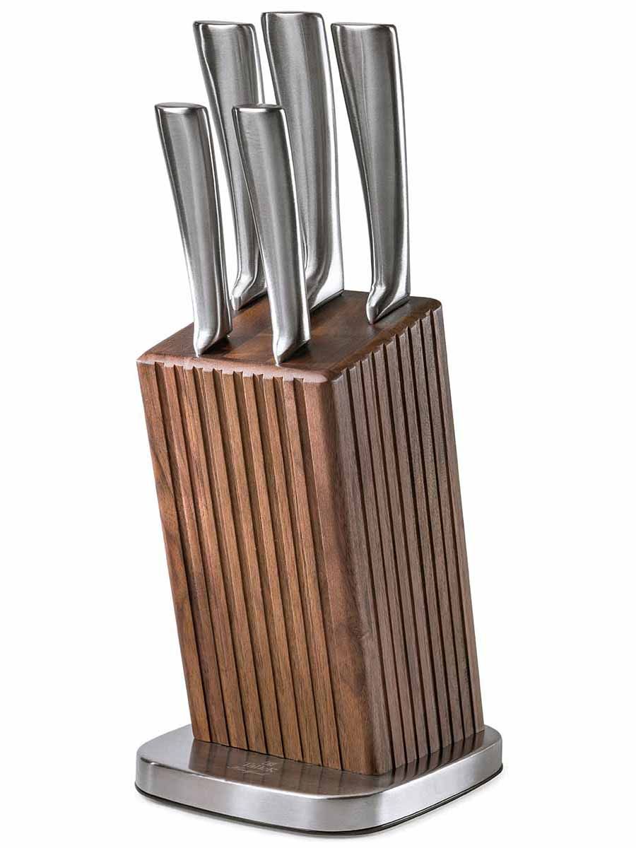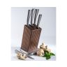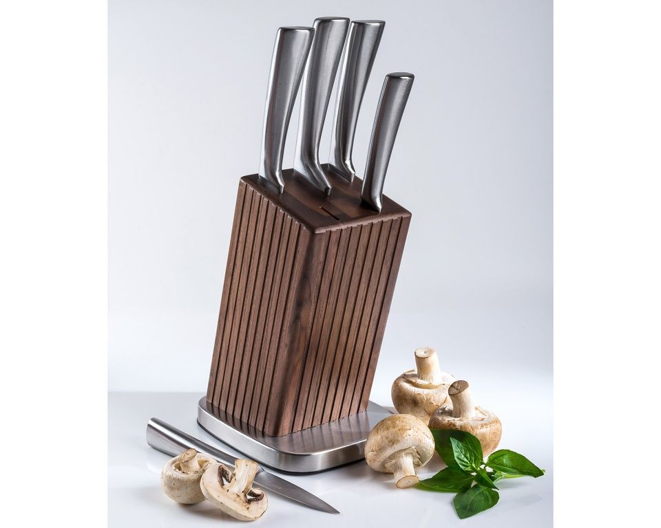 Подставка выполнена из благородной древесины грецкого ореха и нержавеющей стали.Лезвия ножей сделаны из твердой коррозионностойкой стали AISI 420S45 (3Cr13).Рукояти выполнены из нержавеющей стали.