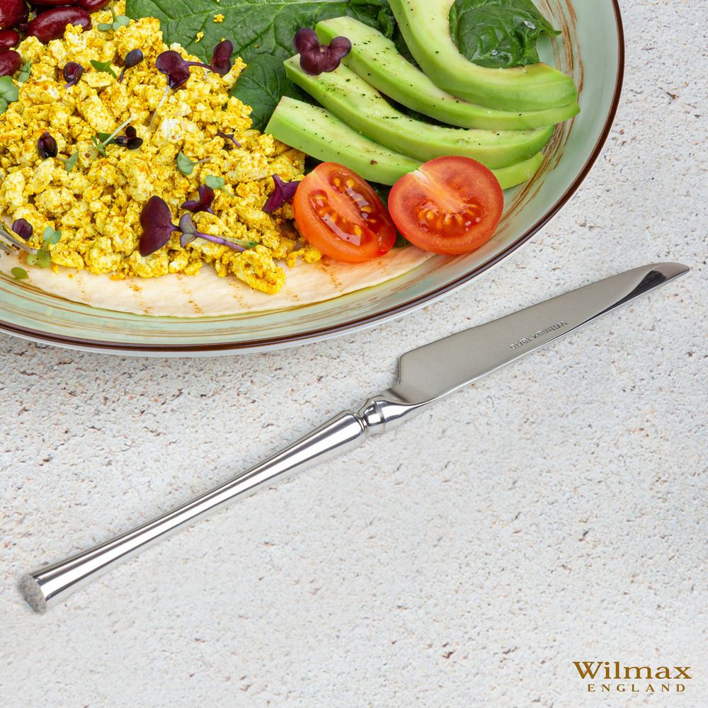 Wilmax презентует столовый нож, который подчеркнет любое блюдо на вашем столе. Он изготовлен из высококачественной нержавеющей стали марки 18/10. Нож прочен и устойчив к коррозии, деформации и притуплению, а также к образованию пятен на их поверхности, вызванных воздействием щелочей и кислот.