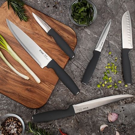 Лезвие ножа сделано из высококачественной нержавеющей стали AISI 420S45. Ручка выполнена из ударопрочного пластика с приятным на ощупь покрытием soft-touch