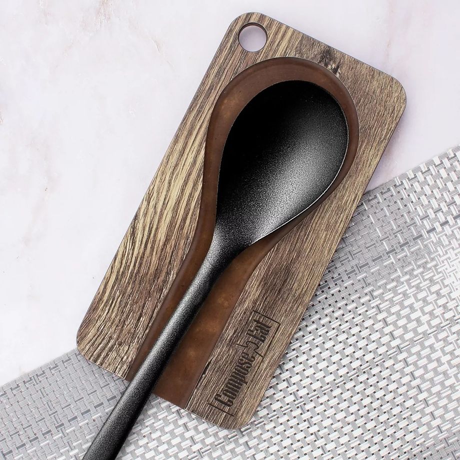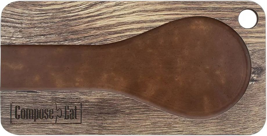 Изделие прямоугольной формы выполнено из многослойного композитного материала на основе крафтовой бумаги с поверхностью цвета мореный дуб и выемкой под ложку на внутренней стороне