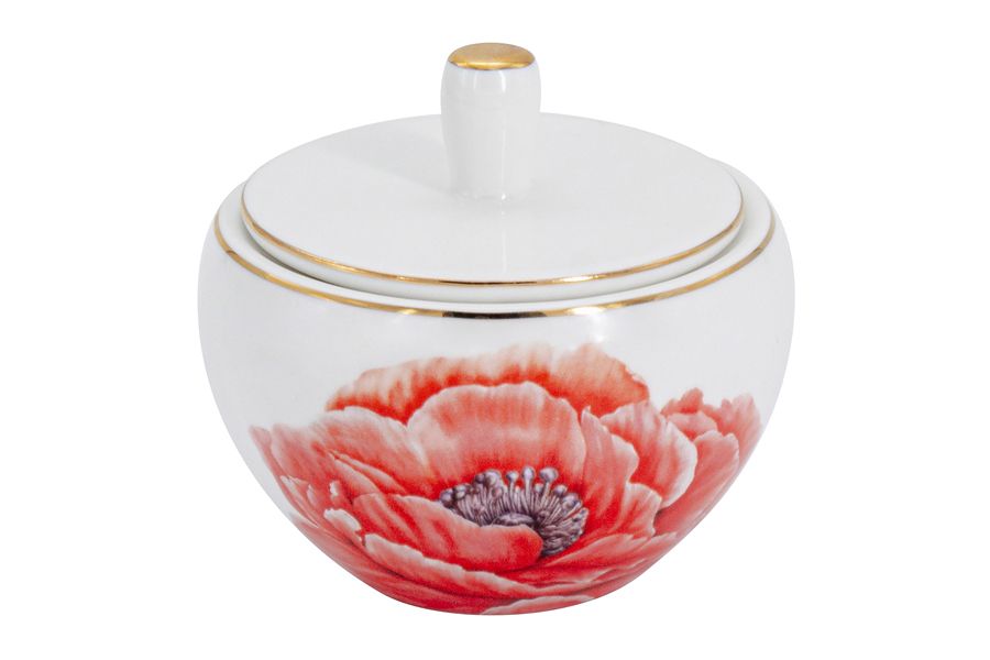 Удобные и современные формы предметов из белоснежного костяного фарфора и натуральный яркий цветочный декор с изображением мака, миддлемиста, гибискуса, ириса, магнолии, стрелиции, камелии и гортензии в сочетании с цветами из матового золота, тонкая золотая отводка — всё говорит о стиле в сервировке и культуре чаепития.