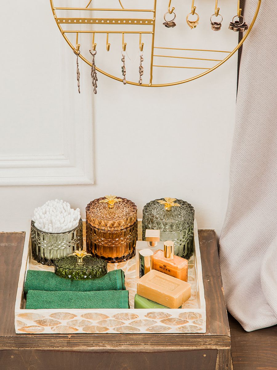 Прозрачные шкатулки из цветного стекла – практичный и эстетичный способ навести порядок в мелочах. В шкатулке с крышкой легко хранить украшения и аксессуары для волос, нитки и иголки, важные записки и даже канцелярию. Удобная ручка в виде нескольких золотистых лепестков, трендовые оттенки – зеленый, оливковый, шоколадный; округлая форма и прозрачный орнамент – всё соответствует популярным природным мотивам в интерьере.