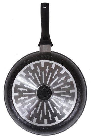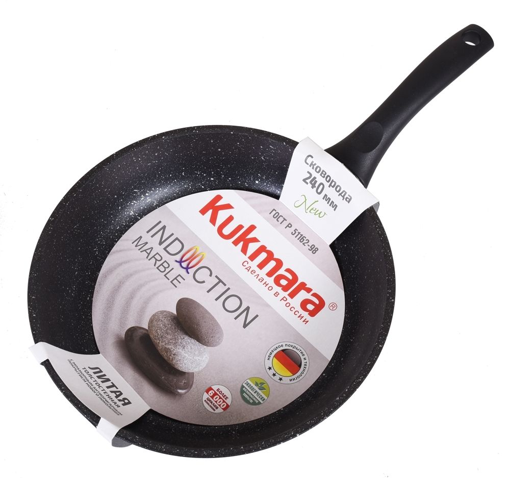 Сковорода "Kukmara" для индукционной плиты изготовлена из литого алюминия и покрыта инновационным антипригарным мраморным покрытием нового поколения на водной основе, усиленным сверхтвердыми частицами минералов.