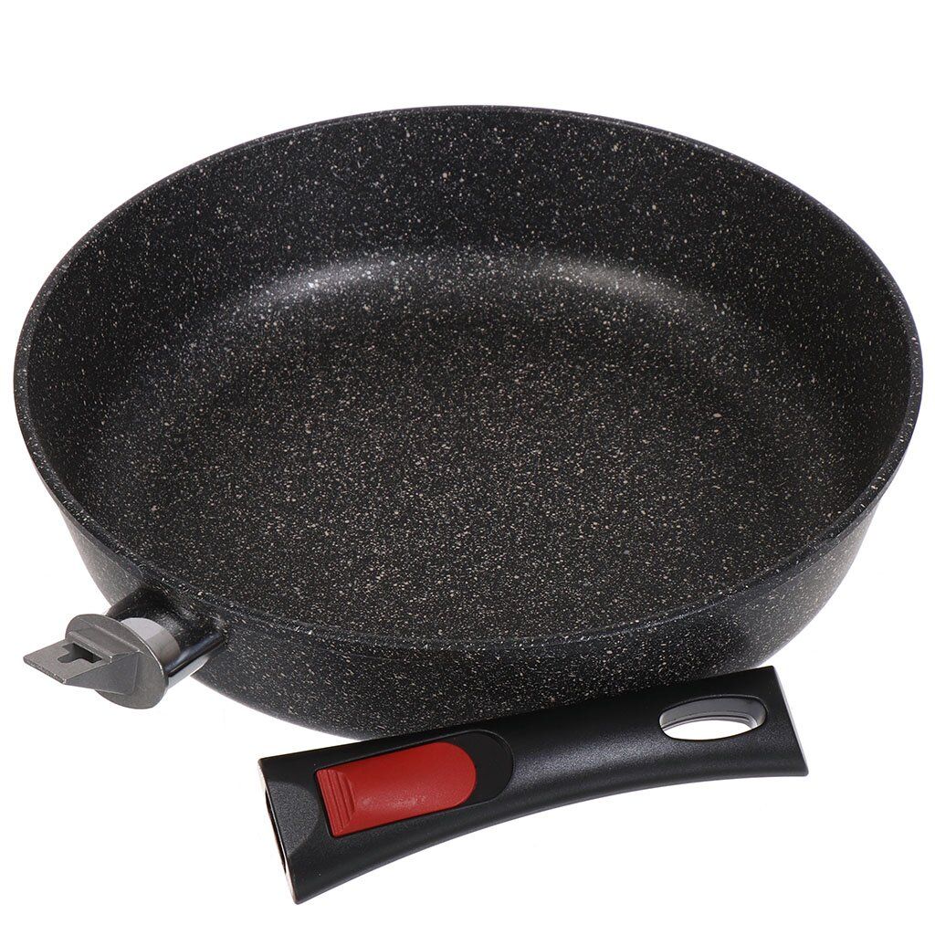 Литой алюминиевый корпус сковороды не подвержен деформации и обеспечивает равномерный нагрев. Многослойное антипригарное покрытие c эффектом натурального камня позволяет готовить с минимальным количеством масла и сохранять натуральный вкус продуктов.