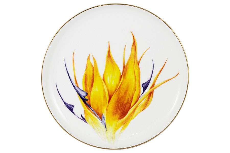 Удобные и современные формы предметов из белоснежного костяного фарфора и натуральный яркий цветочный декор с изображением мака, миддлемиста, гибискуса, ириса, магнолии, стрелиции, камелии и гортензии в сочетании с цветами из матового золота, тонкая золотая отводка — всё говорит о стиле в сервировке и культуре чаепития.