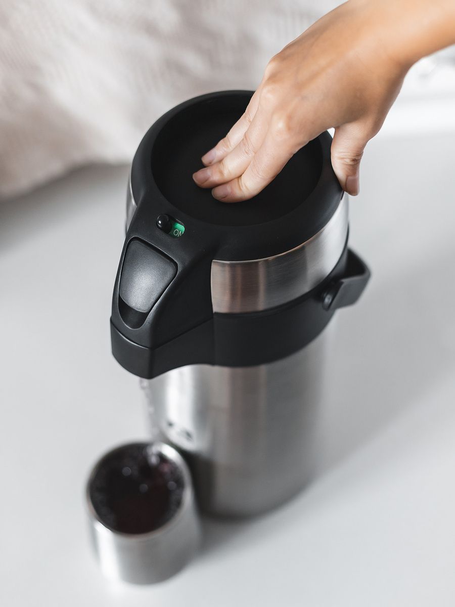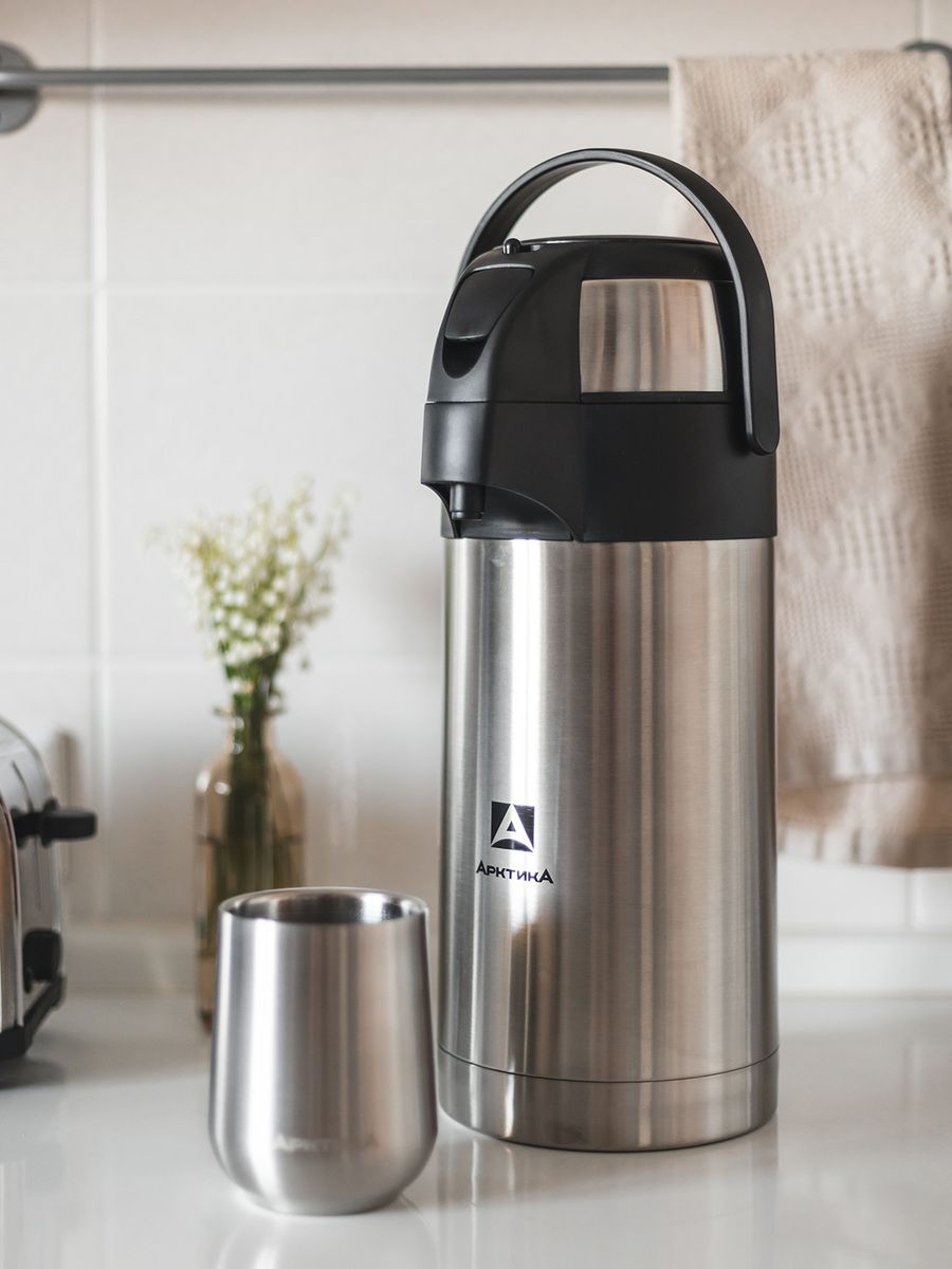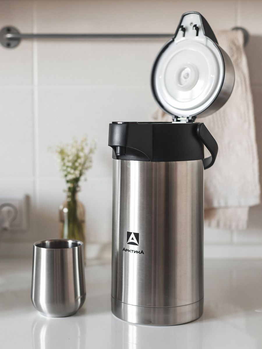 Вместительный термос с помпой – оптимальное решение для хранения дома горячего чая, кофе или прохладного лимонада. Пару нажатий, и напиток у вас в кружке. Незаменим для ситуаций, когда нет доступа к электроэнергии или ее нужно сэкономить, – например, на даче. Имеет высокий показатель удержания температуры.